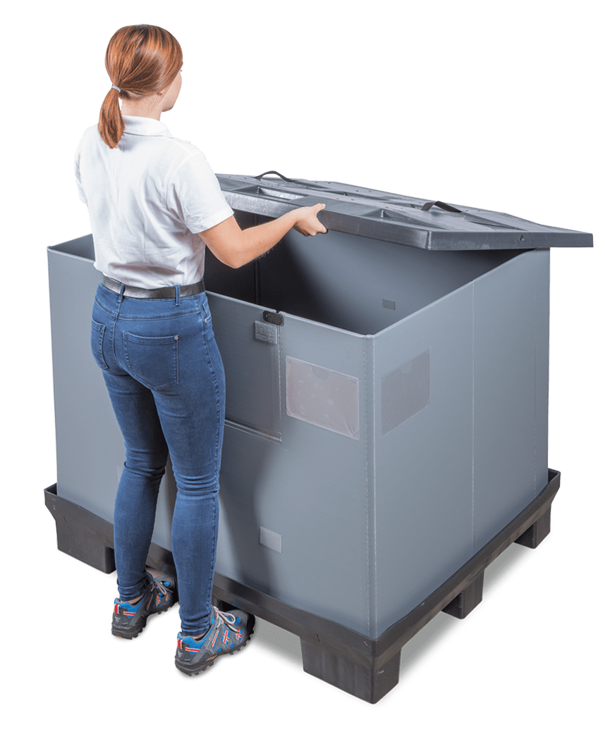 Unsere Mehrweg-Transportbehälter bestehen aus drei Teilen - Palette, Deckel und Ring. Dank unseres einzigartigen Sandwich-Falt-Systems bleibt eine sichere und vor allem vollständige Verpackungseinheit erhalten – sowohl bei vollen als auch bei leeren Behältern.