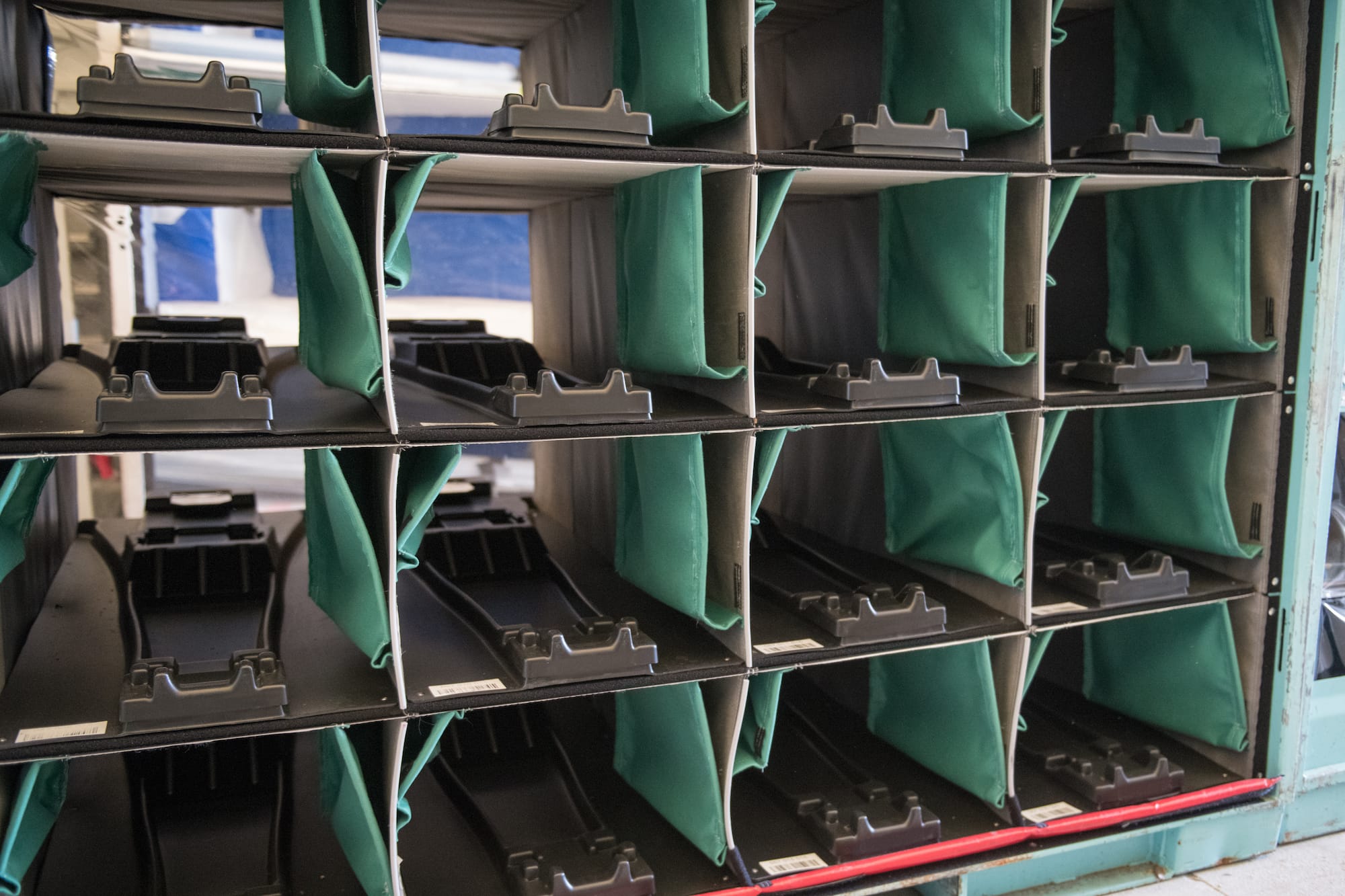 Combining our experience in automotive packaging with our our advanced knowhow of materials and manufacturing techniques, we came up with a unique solution comprising welded steel, a stitched textile dunnage and vacuum formed bottom inserts shaped to the specific geometry of the parts. The inside dimension of each pocket were dimensioned to the biggest part variant and specific features were implemented to guarantee an optimal fit for each of the variants. The rack is designed for random access to each part and easy loading & unloading. A big ergonomic plus for the operators!