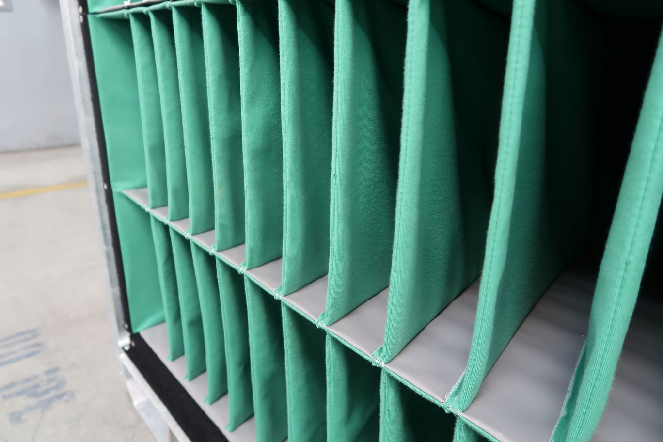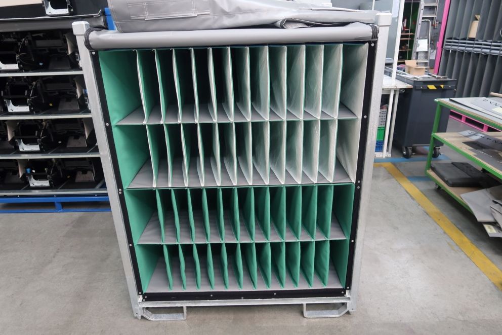 In line with the logistic conditions (limited transport distance) and general specs of the customer our design team developed a steel rack with a textile dunnage as textile offers great protection to the most sensitive part finishes out there. It is also the most appropriate technology for generic packaging systems as the dividers are (contrary to solutions like EPP or vacuum forming) not shaped 100% acc. to the shape of the part allowing for a certain degree of variance in the geometry.