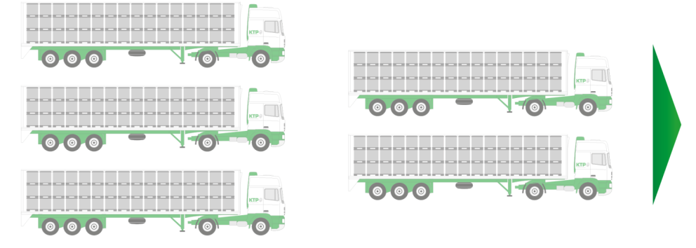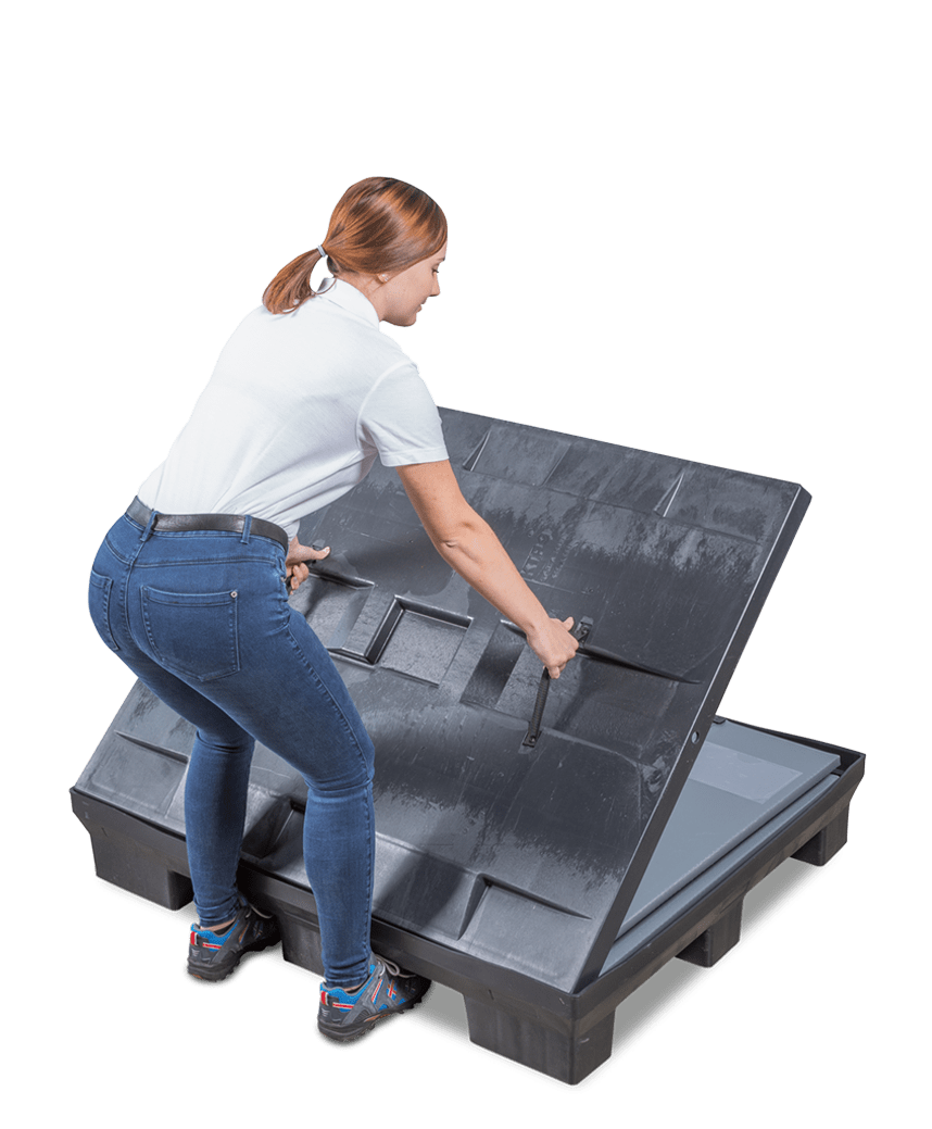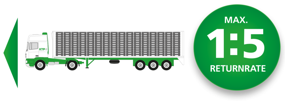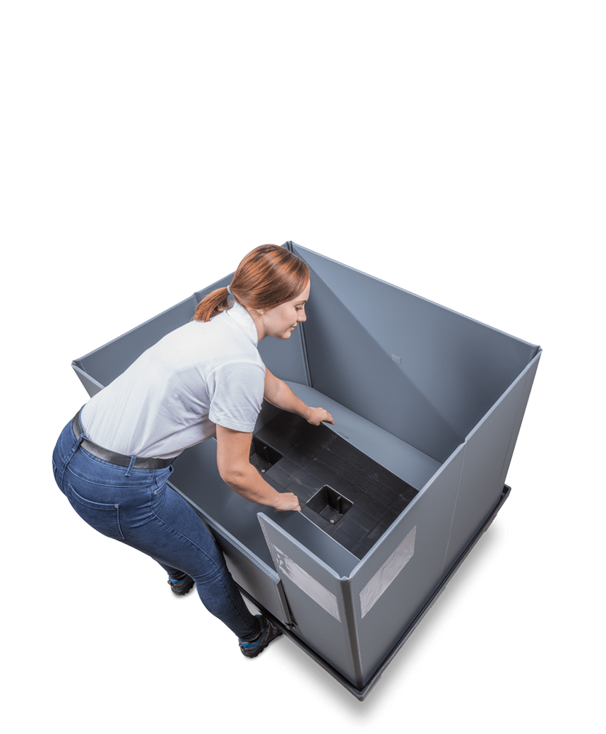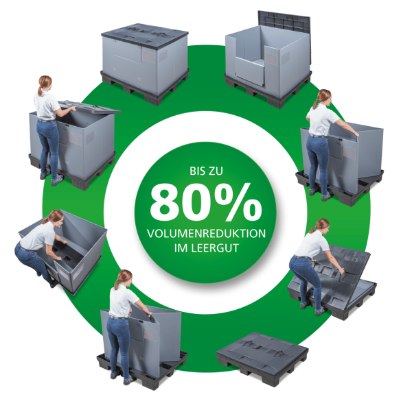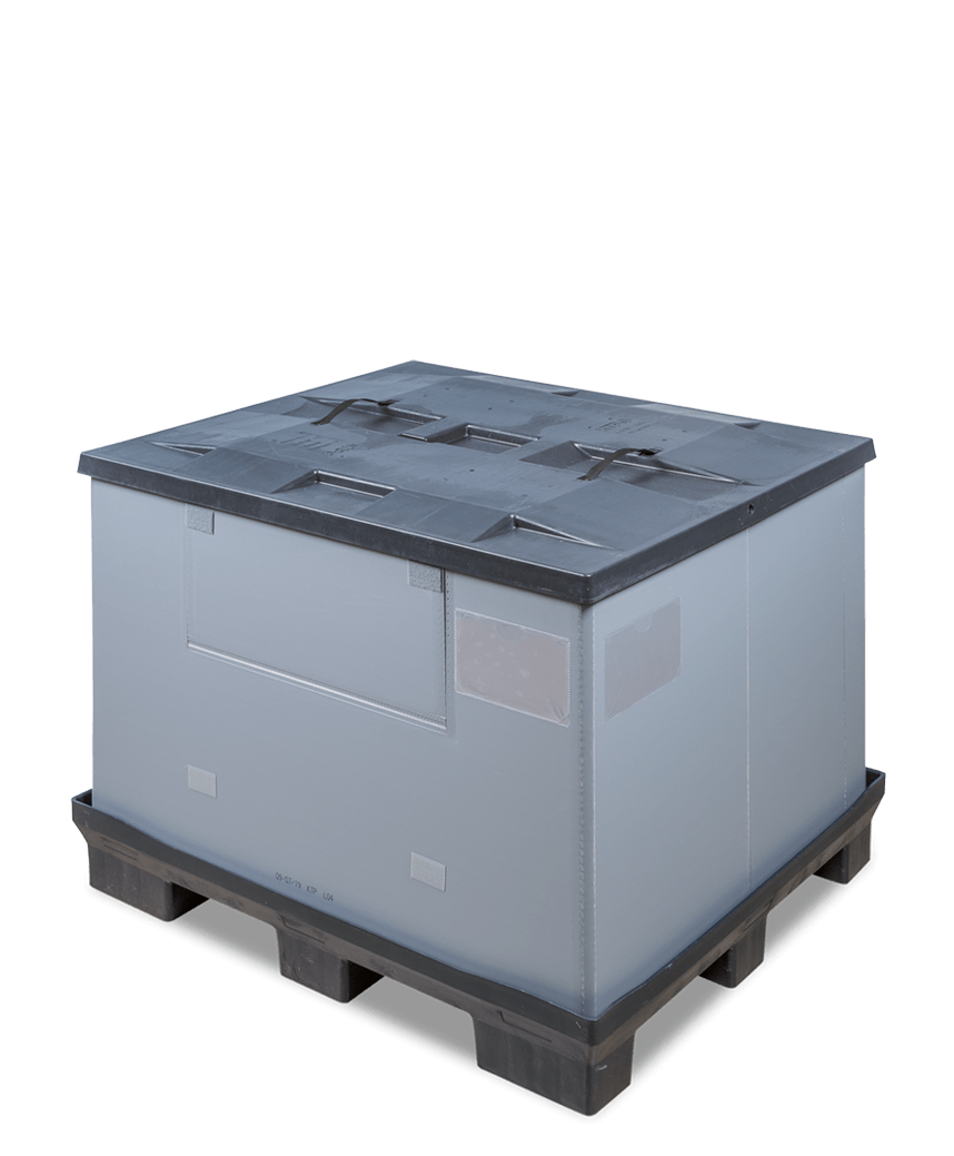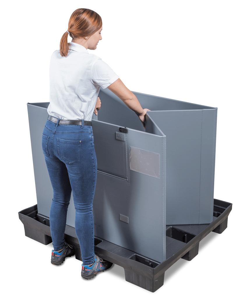 Our reusable transport containers consist of three parts – pallet, lid and ring. Thanks to our unique sandwich folding system, a safe and, above all, complete packaging unit remains in place – in full and empty containers.